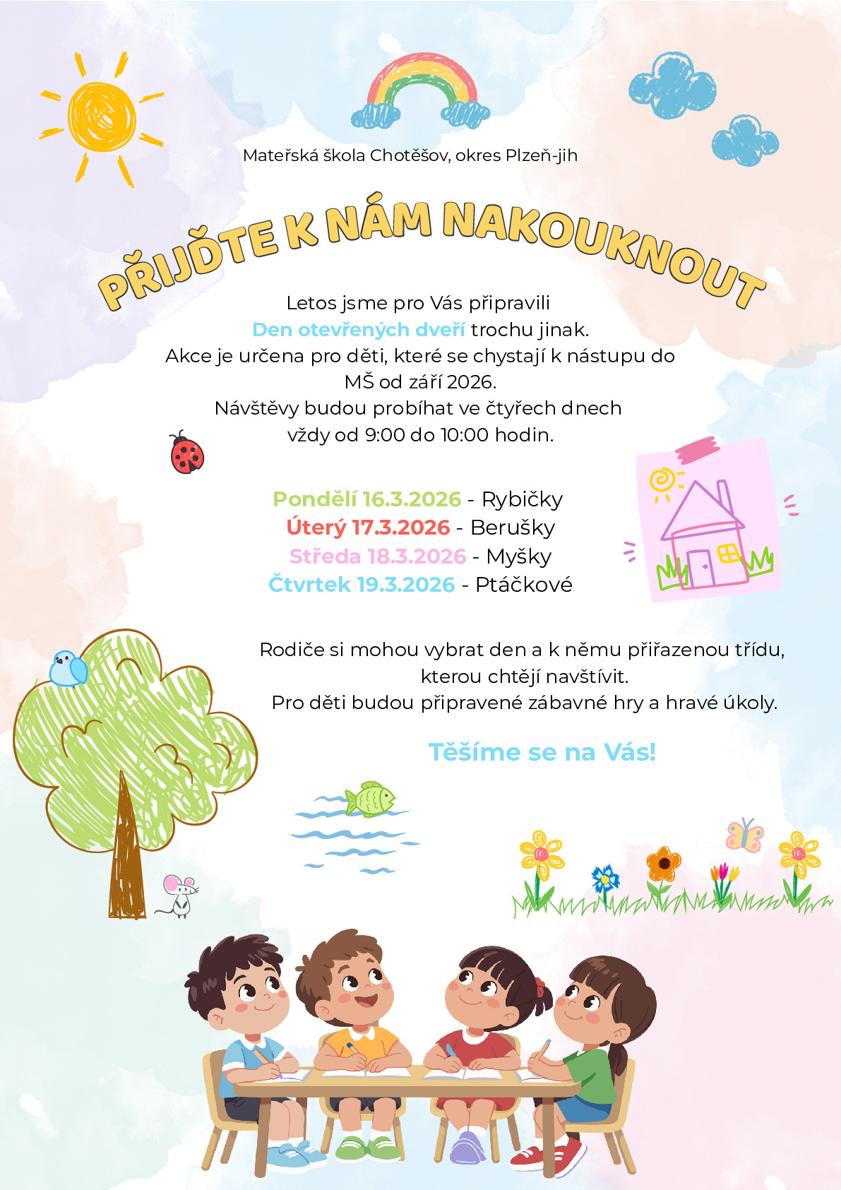 Mateřská škola Chotěšov, Vás zve na DEN OTEVŘENÝCH DVEŘÍ, který proběhne ve dnech 16.–19. března 2026 vždy od 9:00 do 10:00 hodin.